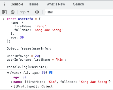 자바스크립트의 상위 객체는 동결되어 값을 수정할 수 없지만, 중첩된 객체는 동결되지 않아 속성 값을 변경할 수 있습니다.