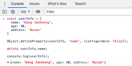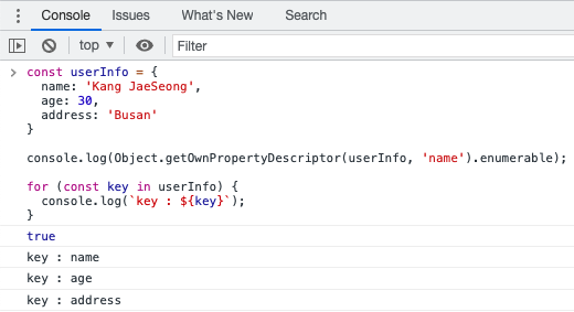 다음은 userInfo.name 속성의 enumerable을 false로 변경 후 for...in 반복문으로 객체의 속성을 접근하는 예제입니다.