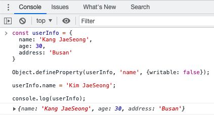 userInfo객체의 name 속성의 설명자 writable 속성 값을 false로 변경 후 name 속성의 값을 변경하면 적용되지 않습니다.