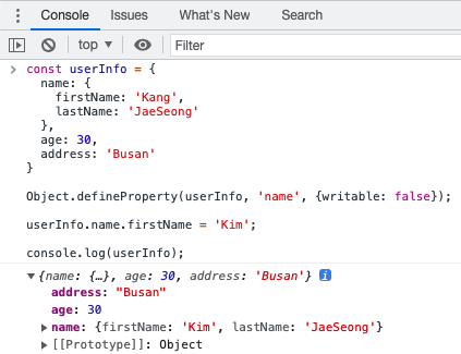 그러나 다음과 같이 중첩된 객체인 경우(속성이 객체인 경우)에는 writable의 속성을 false로 설정해도 값이 변경되는 문제가 존재합니다.