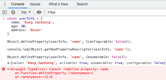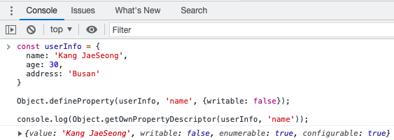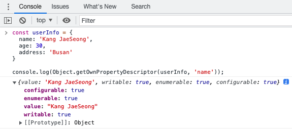 Object.getOwnPropertyDescriptor() 함수를 사용하면, 객체의 속성에 대한 모든 설명을 확인할 수 있습니다. 다음은 userInfo 객체의 name 속성에 대한 설명자입니다.