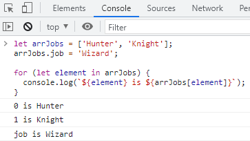 문자열 배열 arrJobs에는 일관성 없는 데이터가 추가되었으며, for...in문은 속성을 반복하므로 정상적으로 동작합니다. 이렇게 일관성 없는 데이터가 존재하는 경우 애플리케이션을 배포하기 전에 문제가 되는 코드를 찾기가 어려우며, 애플리케이션을 배포 후 문제가 발생할 가능성이 존재합니다.