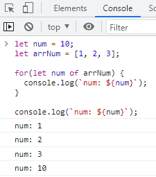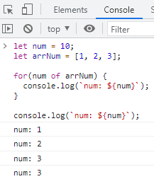 하지만, for...of문을 사용한 경우 본문 외부에 선언된 num 변수의 값을 덮어씁니다.