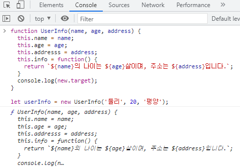 let userInfo = new UserInfo('둘리', 20, '서울');