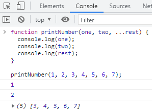 위 예제에서 인수 one은 1을 참조하며 two는 2를 참조하며, 나머지 매개변수인 ...rest는 1과 2 이후에 전달된 모든 인수(3, 4, 5, 6, 7)를 참조합니다.