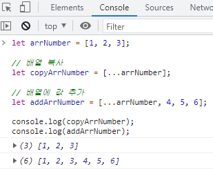 Spread 연산자는 다음 예제처럼 배열을 다른 배열로 복사하거나 배열에 값을 추가하는 용도로 사용할 수 있습니다.