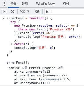 Promise 객체 내에서 발생한 모든 동기 또는 비동기 예외는 Promise 객체 내부의 Promise.prototype.catch로 catch 됩니다. Promise 객체 외부에서는 Promise 객체 내에서 발생한 예외를 catch 할 수 없습니다.