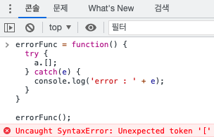 다음은 구문 오류(SyntaxError)를 catch 못하는 예제입니다.