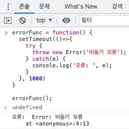 setTimeout() 함수의 콜백 함수에서 발생한 예외를 catch 하기 위해서는 setTimeout() 함수 내부에 try-catch문을 작성합니다.