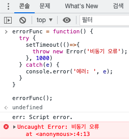 다음 코드의 try-catch문은 setTimeout() 함수의 콜백 함수가 호출될 때 종료되므로 비동기식 콜백 함수에서 발생한 예외를 catch 할 수 없습니다.