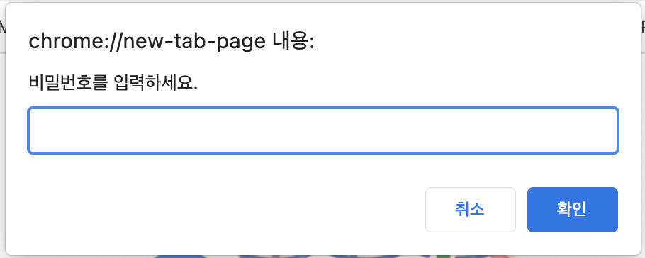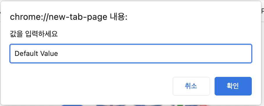 위 사진에서 알 수 있듯이 프롬프트 상자는 두 개의 버튼 "확인"과 "취소"가 있습니다. "확인" 버튼을 클릭하면 사용자가 입력한 값을 문자열로 반환하며 "취소" 버튼을 클릭하면 null을 반환합니다.