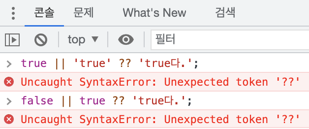 Null 병합 연산자의 주의사항으로 왼쪽에 AND( && ) 및 OR( || ) 연산자를 사용할 수 없습니다. 만약, NULL 병합 연산자 왼쪽에 AND 또는 OR 연산자를 사용하면 SyntaxError가 발생합니다.