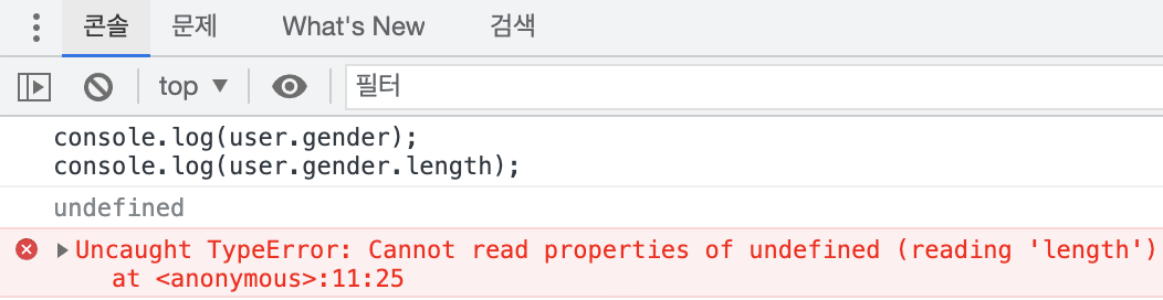 TypeError가 발생하는 이유는 user 객체에 gender 속성이 없으므로 undefined입니다.