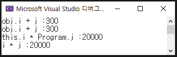 Console.WriteLine("this.i * Program.j :" + (this.i * Program.j));