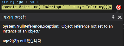 다음과 같이 문자열 변수에 null을 할당 후 ToString() 함수를 호출하면, NullReferenceException 예외가 발생합니다.