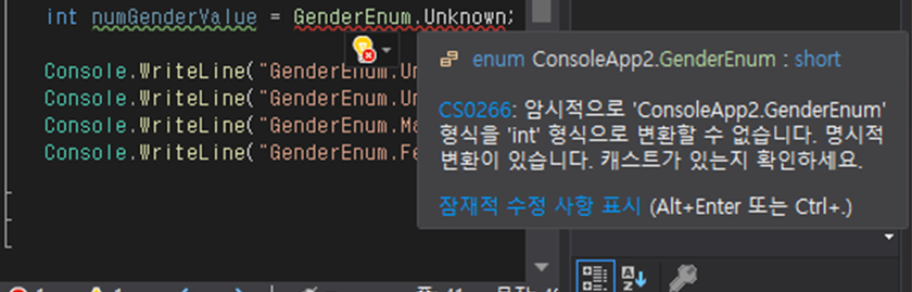 int numGenderValue = (int)GenderEnum.Unknown;으로 형변환 작업을 해주어야 합니다.