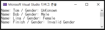 위 예제는 정상적으로 실행되지만, 성별(Gender)을 관리하기 어렵다는 문제가 발생합니다. 다음은 Gender에 정의된 값들을 열거형으로 정의하는 방법입니다.