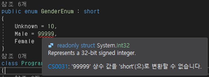 ▶ 열거형 값이 자료형의 범위를 벗어나는 경우 다음과 같이 컴파일 에러가 발생합니다.