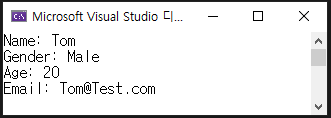 return "Name: " + Name + " / Gender: " + Gender + " / Age: " + Age + " / Email: " + Email;