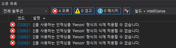 배열은 .Net 프레임워크에서 정의된 클래스이며 배열의 값을 인덱스를 사용하여 접근할 수 있도록 구현되어 있습니다. 하지만, Person 클래스는 사용자(혹은 개발자)가 정의한 클래스이며 인덱서 기능이 없으므로 배열처럼 사용하면 오류가 발생합니다.
