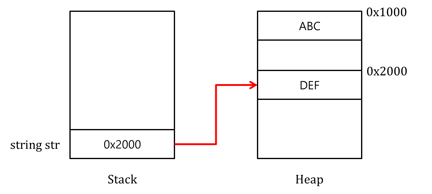string 타입의 변수 str의 값을 변경하면, 힙에 생성된 문자열 "ABC"가 "DEF"로 변경되는게 아니라 새로운 공간이 생성됩니다. 그리고 스택에 할당된 문자열 변수 str의 메모리 공간은 문자열 "DEF"의 주소 값 0x2000을 참조합니다.