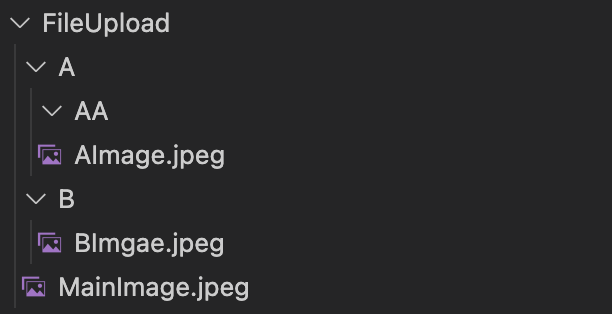 FileUpload 폴더가 존재하며, FileUpload에는 A, B 폴더 그리고 MainImage.jpeg 파일이 존재합니다.