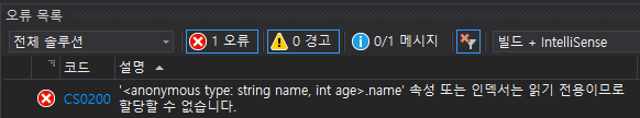 System.Object에서 파생되었습니다. - 익명 타입의 프로퍼티는 읽기 전용이므로 값을 변경할 수 없습니다.