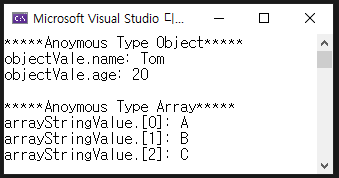 익명 타입으로 객체와 배열로 초기화하는 경우 객체는 속성으로 배열은 인덱스로 접근하여 값을 확인할 수 있습니다. 다음은 익명 타입인 객체와 배열의 값을 확인하는 예제입니다.
