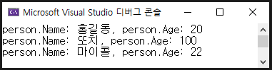 Console.WriteLine("person.Name: " + person.Name + ", person.Age: " + person.Age);