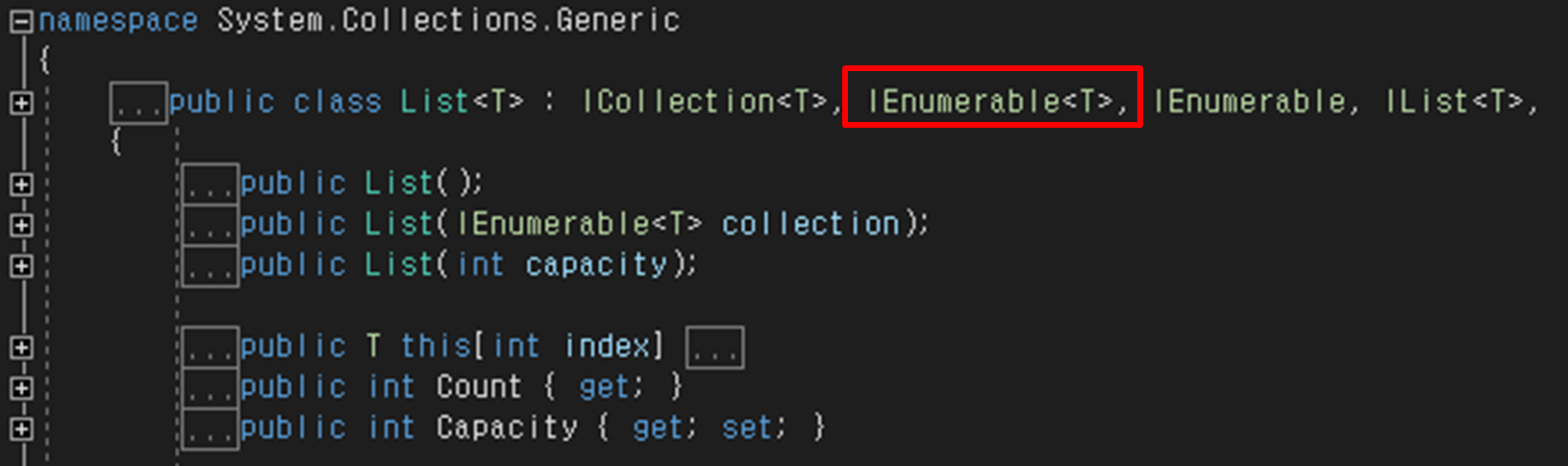 List, Stack, Queue와 같은 컬렉션은 이미 IEnumerable 인터페이스를 가지고 있으며, 구현되어 있기 때문에 foreach문으로 반복적으로 컬렉션 요소를 접근할 수 있습니다.