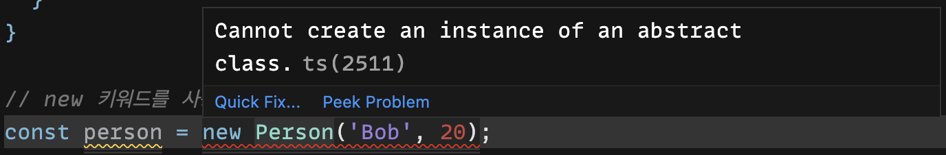 하지만 추상 클래스는 구체 클래스의 도면 혹은 설계서이므로 객체 인스턴스를 생성할 수 없습니다. 만약, 위 코드처럼 추상 클래스의 객체 인스턴스를 생성하는 경우 TypeScript는 Cannot create an instance of an abstract class.라는 오류를 표시합니다.