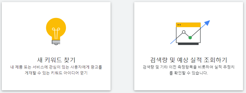 키워드 플래너를 선택하면 다음과 같이 두 가지 기능이 화면에 표시됩니다.