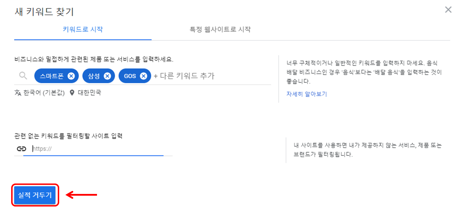 키워드로 시작에서는 단어 또는 문장을 입력하여 키워드를 찾을 수 있습니다. 최대 10개까지 입력 가능하며 필터로 사용할 도메인을 입력할 수 있습니다. 검색어 입력 후 실적 거두기를 클릭합니다.