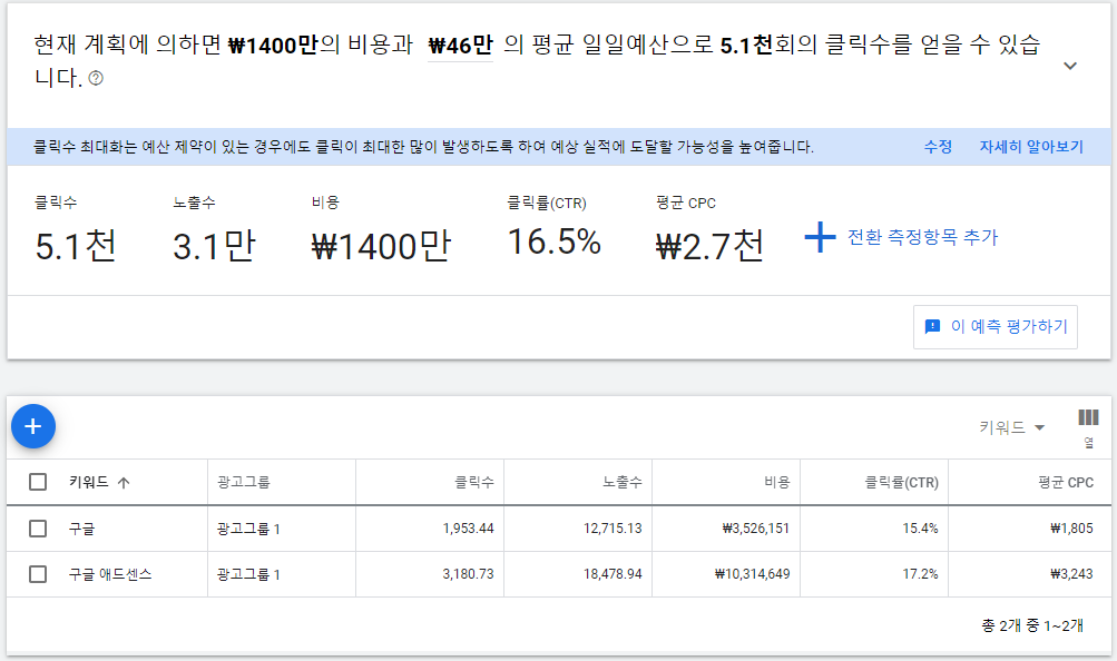 시작하기 버튼을 클릭하고 좌측의 예측 탭을 클릭합니다. 입력한 키워드에 대해 총 클릭수, 노출수, 전체 비용, 평균 CPC 및 CTR 예측 결과를 구할 수 있습니다.