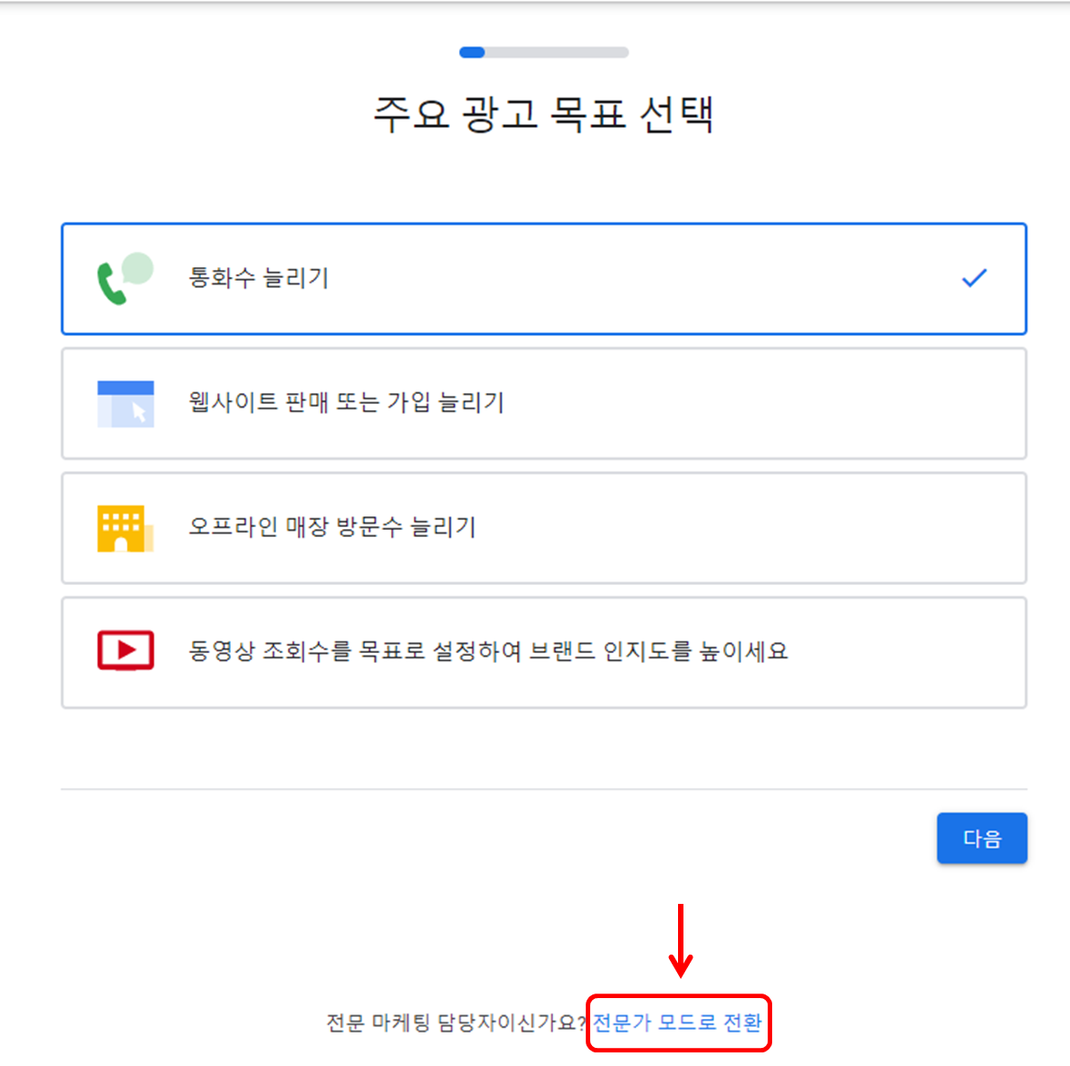 시작하기를 클릭하면 Google Ads에서 새 캠페인 생성을 요청합니다. 광고를 판매하는게 목적이 아니므로 전문가 모드로 전환을 클릭합니다.