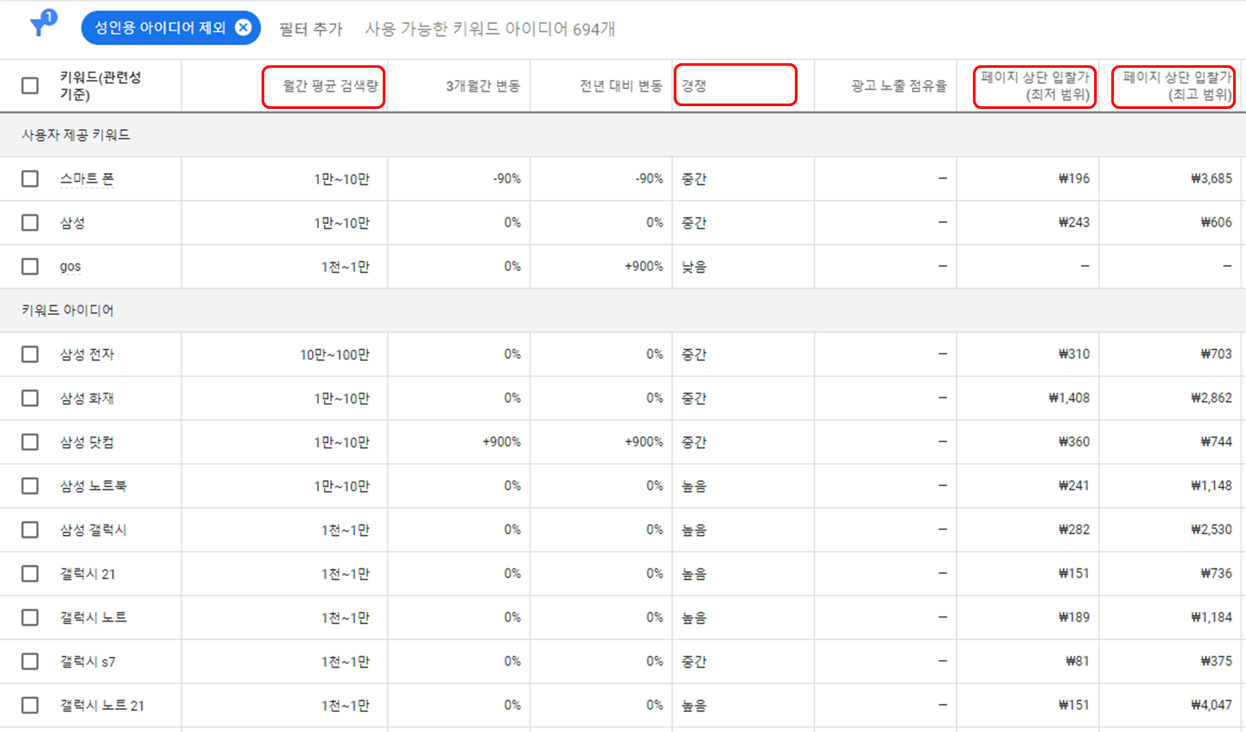 다음은 구글 키워드 플래너가 표시하는 네 가지 측정항목입니다.