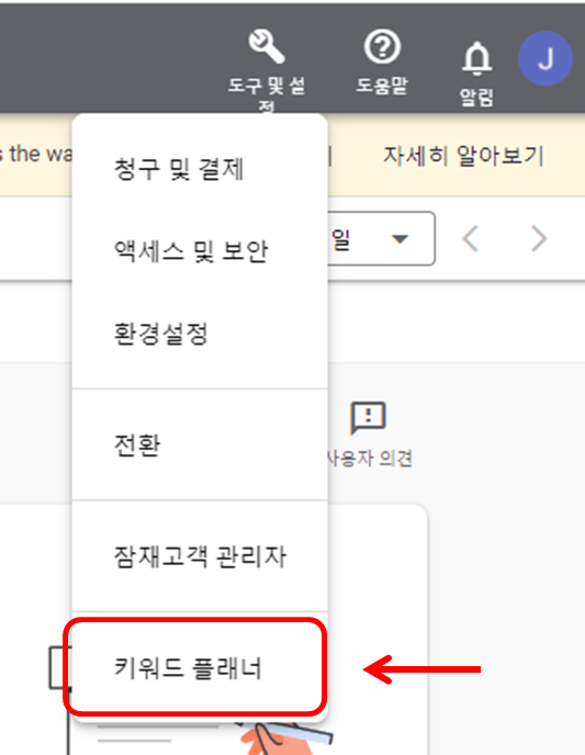 구글 키워드 플래너를 시작하기 위해 우측 상단의 도구 및 설정을 클릭합니다. 드롭다운 메뉴에서 키워드 플래너를 선택합니다.