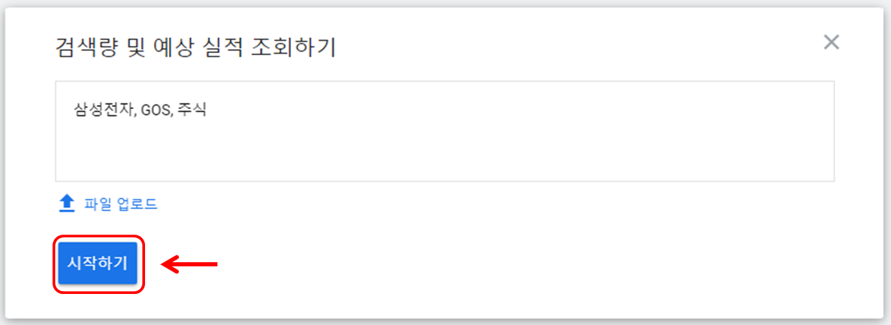 텍스트 박스에 단어 또는 문장을 쉼표로 구분하여 입력할 수 있습니다. 키워드 입력 후 시작하기 버튼을 클릭합니다.