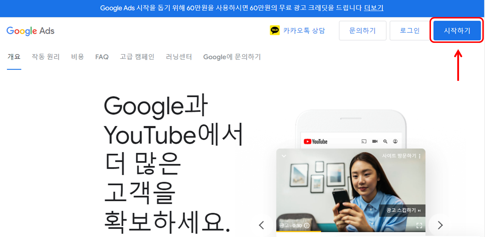 Google Ads 홈페이지로 이동하여 시작하기를 클릭합니다.