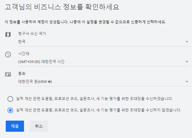 청구서 수신 국가, 시간대, 통화와 같은 비즈니스 정보를 입력합니다. 정보를 입력했으면 제출을 클릭합니다.