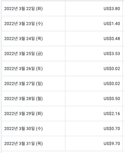 3월 22일부터 오늘까지 제 블로그 수익입니다. 3월 31일부터 급격하게 수익이 오른 것을 확인할 수 있으며 포스팅 날짜가 3월 31일이므로 더 상승할 거라 예상됩니다. 3월 31일에 수익이 급격하게 오른 이유는 3월 30일에 구글 애드센스 및 여러 가지 설정을 했기 때문입니다.