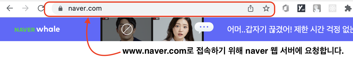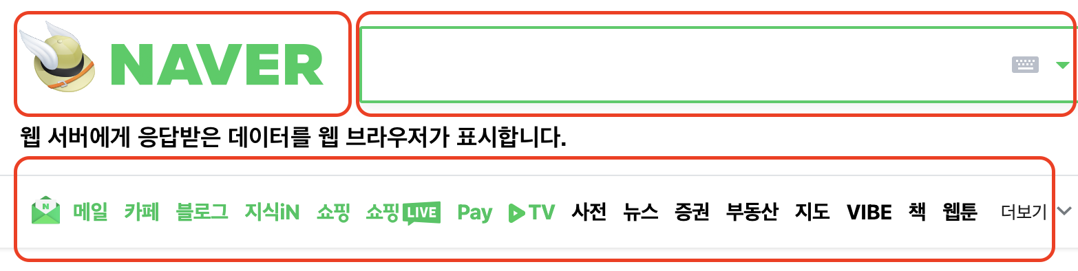 네이버의 웹 서버는 수신받은 요청을 처리하고 웹 클라이언트에게 필요한 데이터들을 응답(Response)합니다. 웹 브라우저는 웹 서버에서 응답받은 데이터(이미지, 텍스트, 파일, 동영상 등)를 화면에 표시합니다.