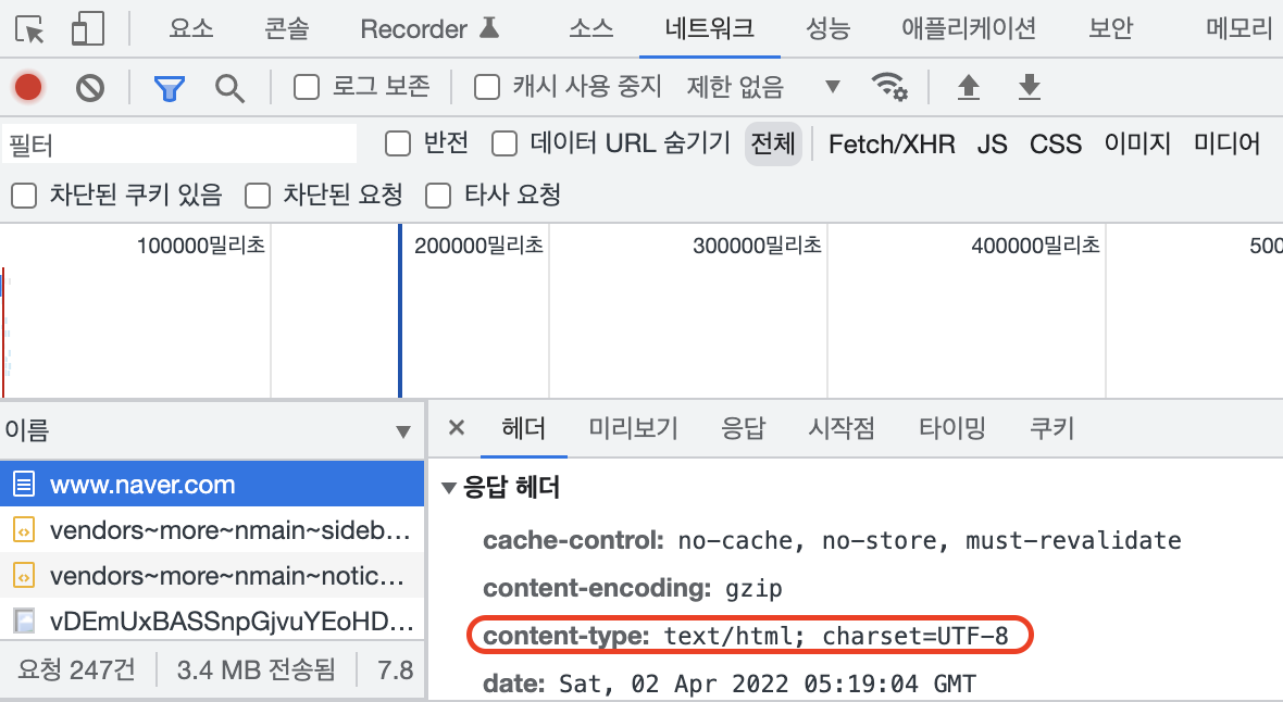 Content-Type은 크롬 브라우저의 개발자 도구에서 [네트워크]탭에서 확인할 수 있습니다.