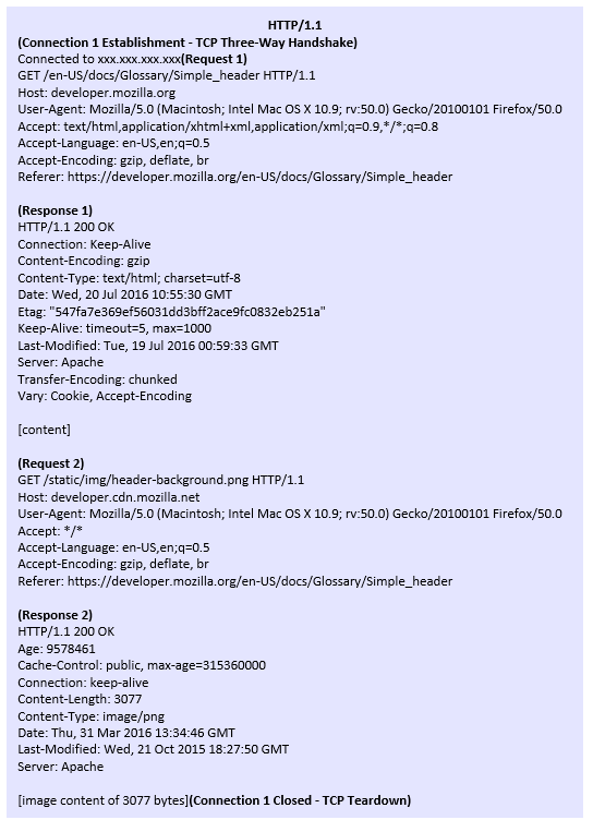 - HTTP/0.9와 HTTP/1.0은 요청에 대한 응답을 받으면 연결이 바로 종료되었습니다. 하지만 HTTP/1.1은 지속적인 연결이 가능합니다.