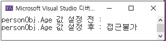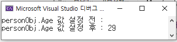 Console.WriteLine("personObj.Age 값 설정 후 : " + personObj.Age);