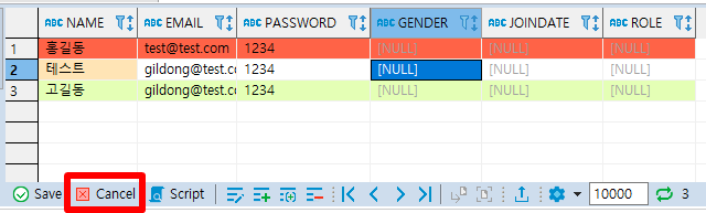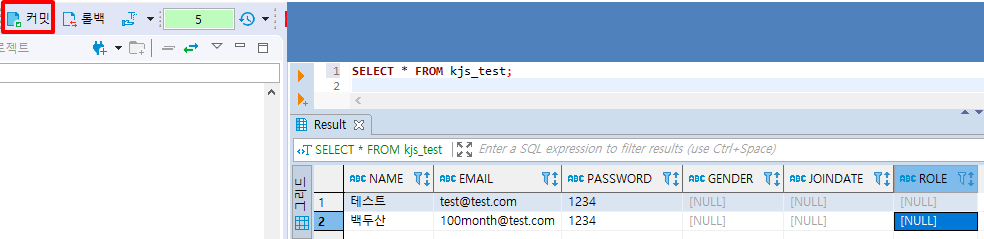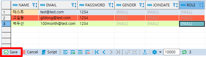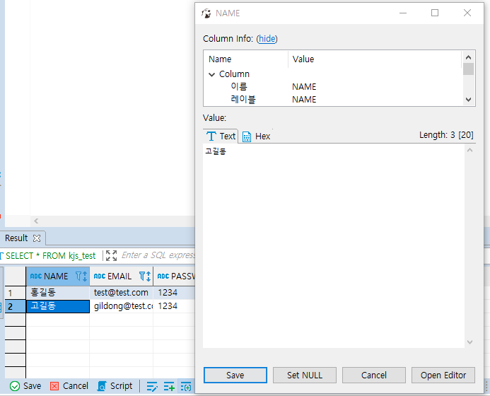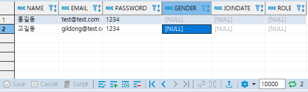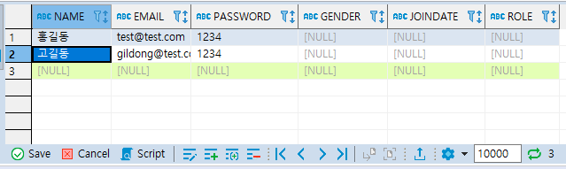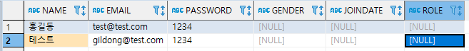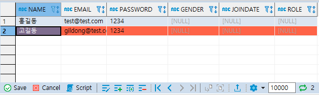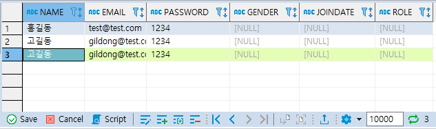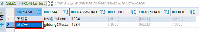 ② NAME이 고길동이고 EMAIL이 gildong@test.com인 행을 추가한 SQL