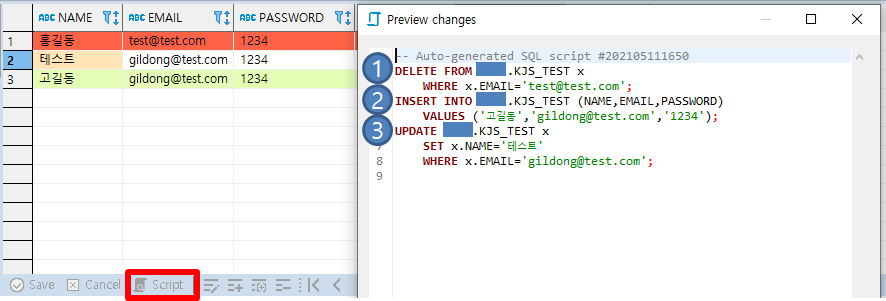 ③ EMAIL이 gildong@test.com인 행을 삭제한 SQL