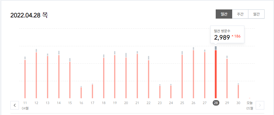 4월 최대 일일 방문수는 2,989입니다. 아쉽게 3,000을 달성하지 못했습니다.