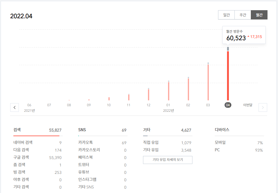 2022년 4월 방문수는 60,523입니다. 3월에 방문수는 43.208이었으며 1.4배 상승했습니다. 3월에는 삼일절과 대통령 선거가 있었지만 4월에는 공휴일이 없었으므로 비교적 많이 상승한 걸로 보입니다. 만약, 3월에 공휴일이 없었다면 방문수 상승률은 1.3배로 예상되네요.