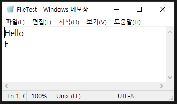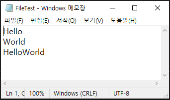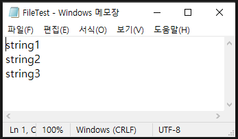 WriteLine() 메서드를 사용하는 경우 라인이 추가된 것을 확인할 수 있으며, StreamWriter 객체를 close() 후 FileStream 객체도 close() 합니다.